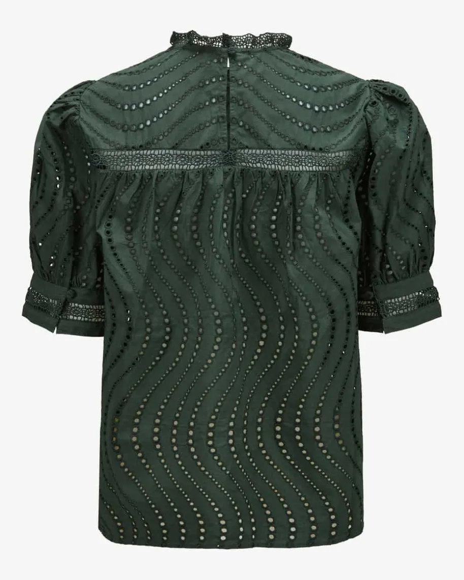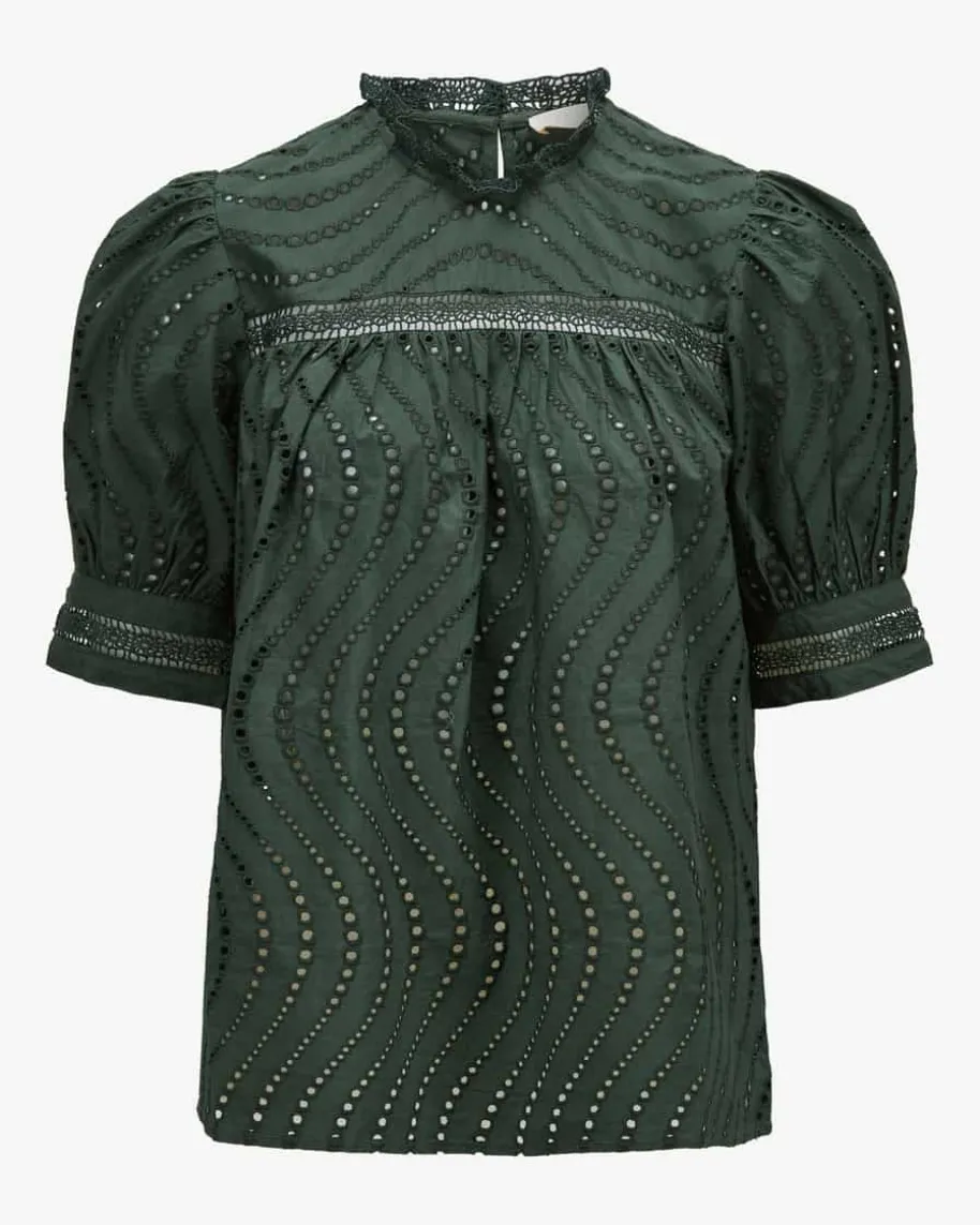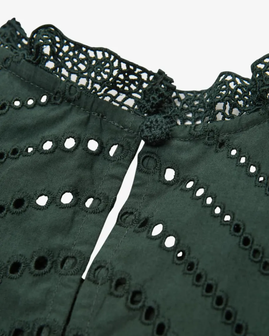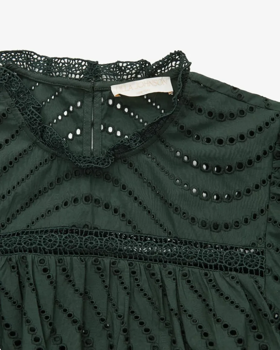 Virginia Bluse für Damen von Ulla Johnson in Dunkelgrün. Die New YorkerDesignerin steht für Boho-Luxus mit femininen Volants, Stickereien undfließenden Stoffen. Auch dieses Modell präsentiert sich in romantisch-femininerAufmachung, während die semi-transparente Lochspitze mit feinem Wellenmuster imBoho-Look einen stilvollen Begleiter kreieren.