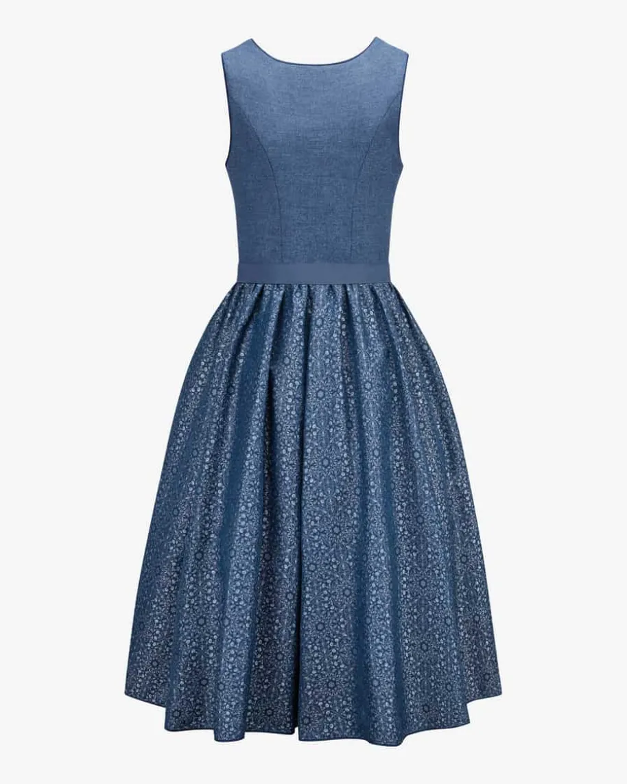 Vlora Dirndl lang mit Schürze für Damen von Kinga Mathe in Marine und Hellblau.Mit Liebe zum Detail entwirft das deutsche Label aufwendige Trachten-Kreationenmit dem gewissen Etwas und überzeugt Trachten-Liebhaber mit erlesenerStoffauswahl sowie kreativen Designs. Auch dieses Modell überzeugt dank desfloralen Dessins in traditioneller Aufmachung und wird durch tonigePaspelierungen stilvoll geziert. Während der Unterrock mit Volant-Saum einefeminine Passform verleiht, komplettiert die changierende Schürze mit Seide dengemusterten Rock harmonisch.