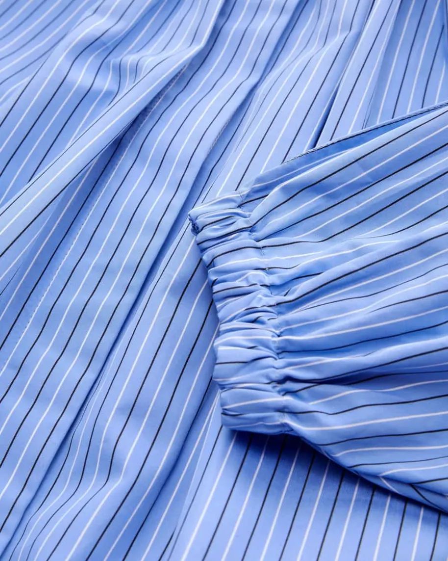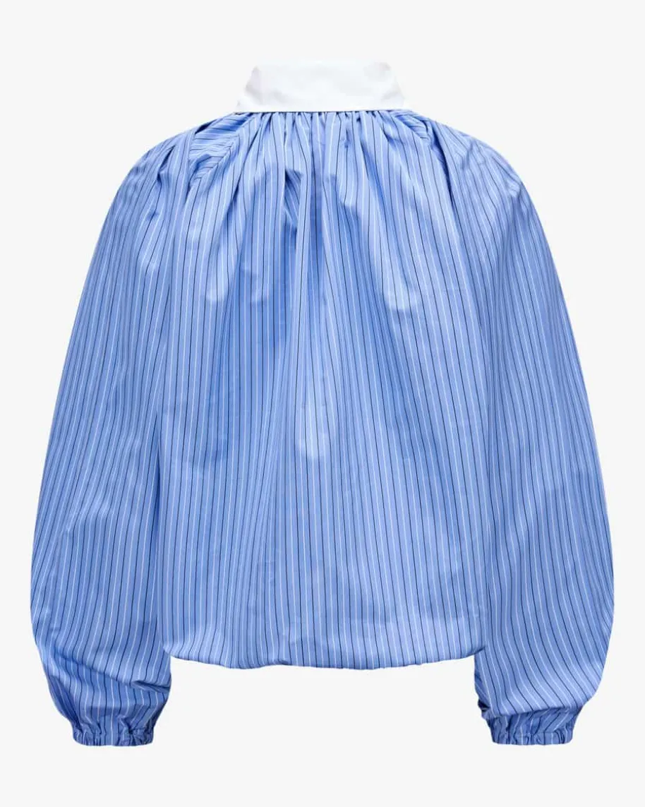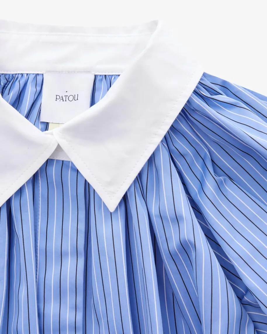 Volume Collar Hemdbluse für Damen von Patou in Hellblau, Weiß und Schwarz. DasModell präsentiert sich mit klassischen Hemd-Details, wird jedoch durch dieoriginelle boxy Schnittführung sowie den elastischen Bündchen zu einem wahrenHingucker. Das markante Streifen-Webmuster in Kombination mit dem farblichabgesetzten Hemdkragen verleiht dem Look einen modischen Twist.