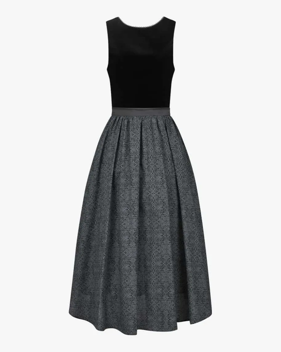 Wiesndirndl lang mit Schürze für Damen von LODENFREY München 1842 in Schwarz undGrau. Dank der Verwendung von hochwertiger Baumwollsamt-Qualität im Mieder undeinem feinen Ornament-Muster im Rock wird ein traditioneller Favorit mitminimalistischem Charme kreiert. Die changierende Schürze mit Seide rundet dasTrachten-Gesamtbild harmonisch ab.