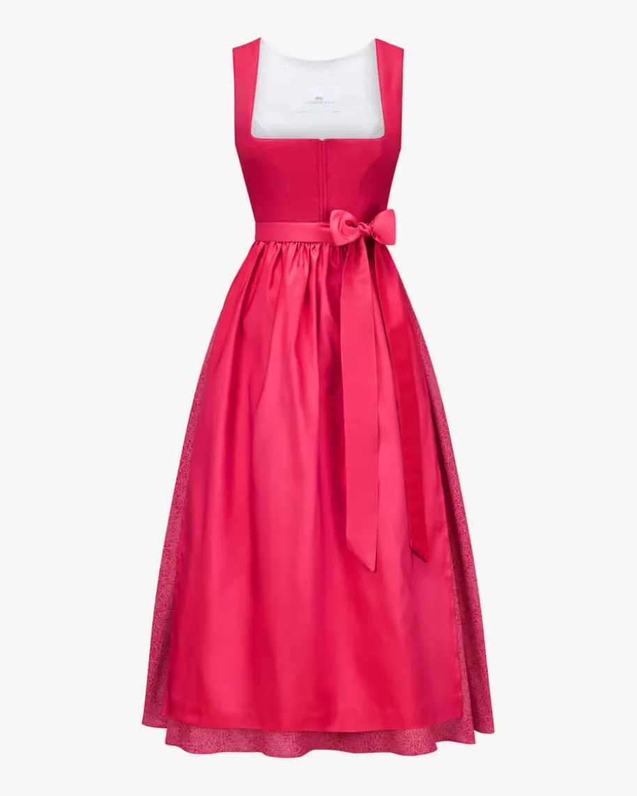 Wiesndirndl lang mit Schürze für Damen von LODENFREY München 1842 in Rot. Dankder Verwendung von hochwertiger Leinen-Qualität im Mieder und einem feinenOrnament-Muster im Baumwoll-Rock wird ein traditioneller Favorit mitminimalistischem Charme kreiert. Die changierende Schürze mit Seide rundet dasTrachten-Gesamtbild harmonisch ab.