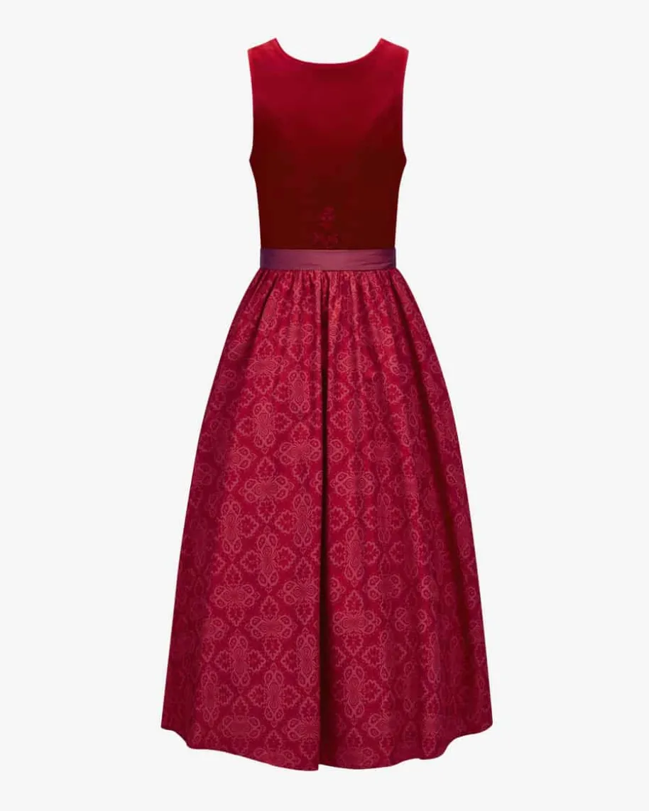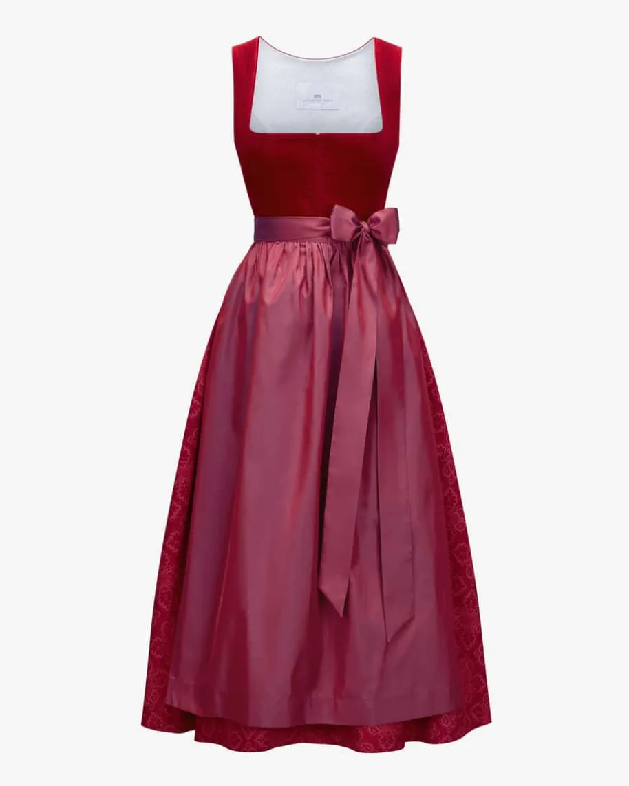 Wiesndirndl lang mit Schürze für Damen von LODENFREY in Rot. JahrelangeErfahrung, hochwertige Verarbeitung und viel Liebe zum Detail zeichnen dieexklusiven Kreationen aus. Das Mieder in edel wirkender Samt-Optik wird dank desgereihten Rocks mit dem floralen Ornamente-Muster stilvoll ergänzt, während diechangierende Schürze das hochwertige Gesamtbild gekonnt vollendet. Gleichzeitigverleiht eine raffinierte Herz-Stickerei auf der Rückseite des Mieders IhremTrachten-Look das gewisse Etwas.