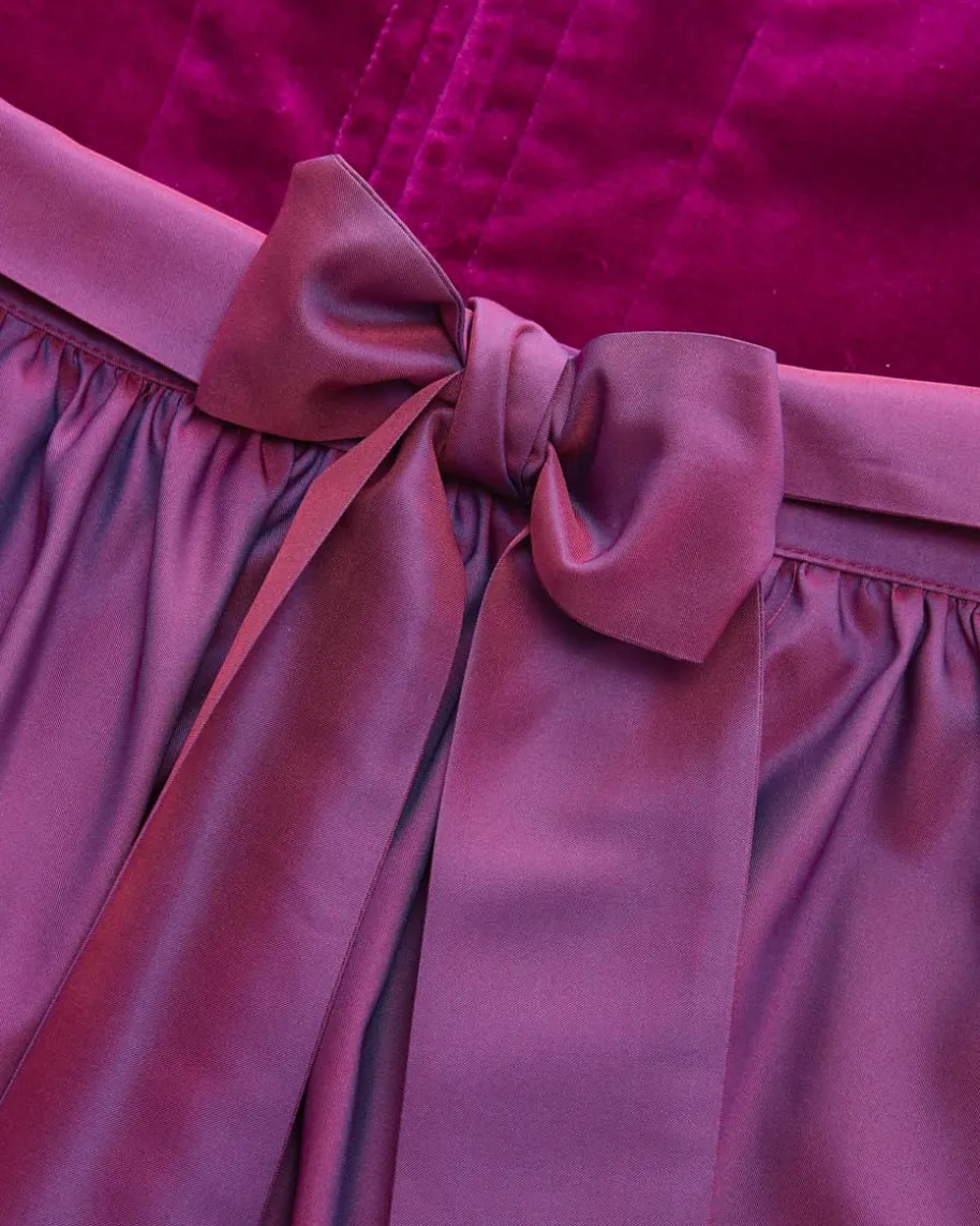 Wiesndirndl lang mit Schürze für Damen von LODENFREY München 1842 in Beere undAltrosa. Dank der Verwendung von hochwertiger Baumwollsamt-Qualität im Miederund einem feinen Ornament-Muster im Rock wird ein traditioneller Favorit mitminimalistischem Charme kreiert. Die changierende Schürze mit Seide rundet dasTrachten-Gesamtbild harmonisch ab.