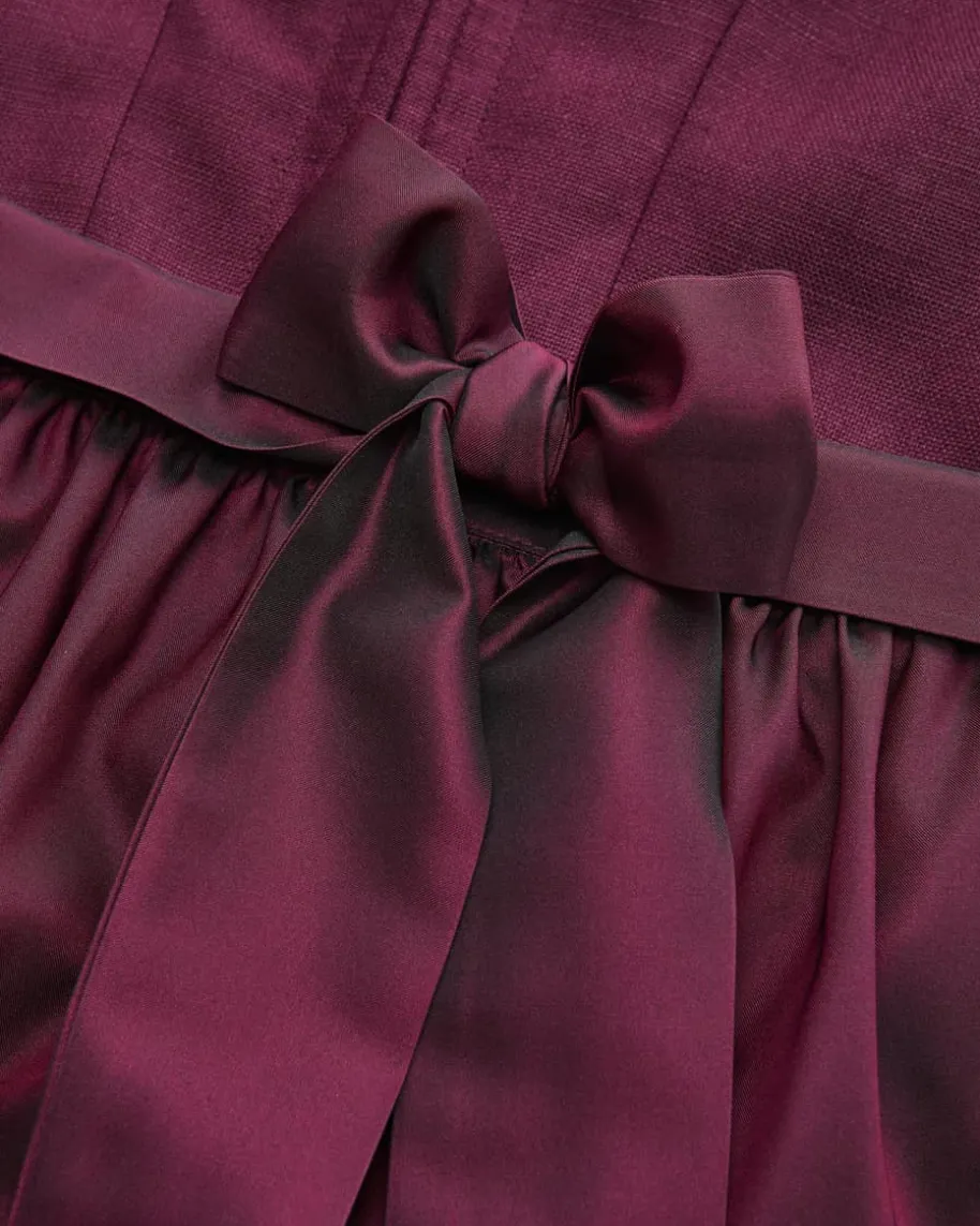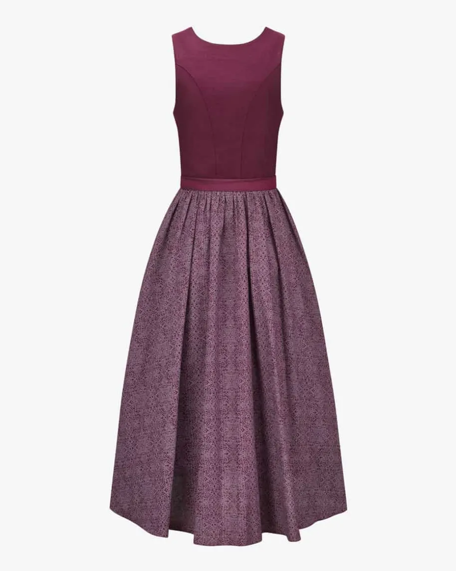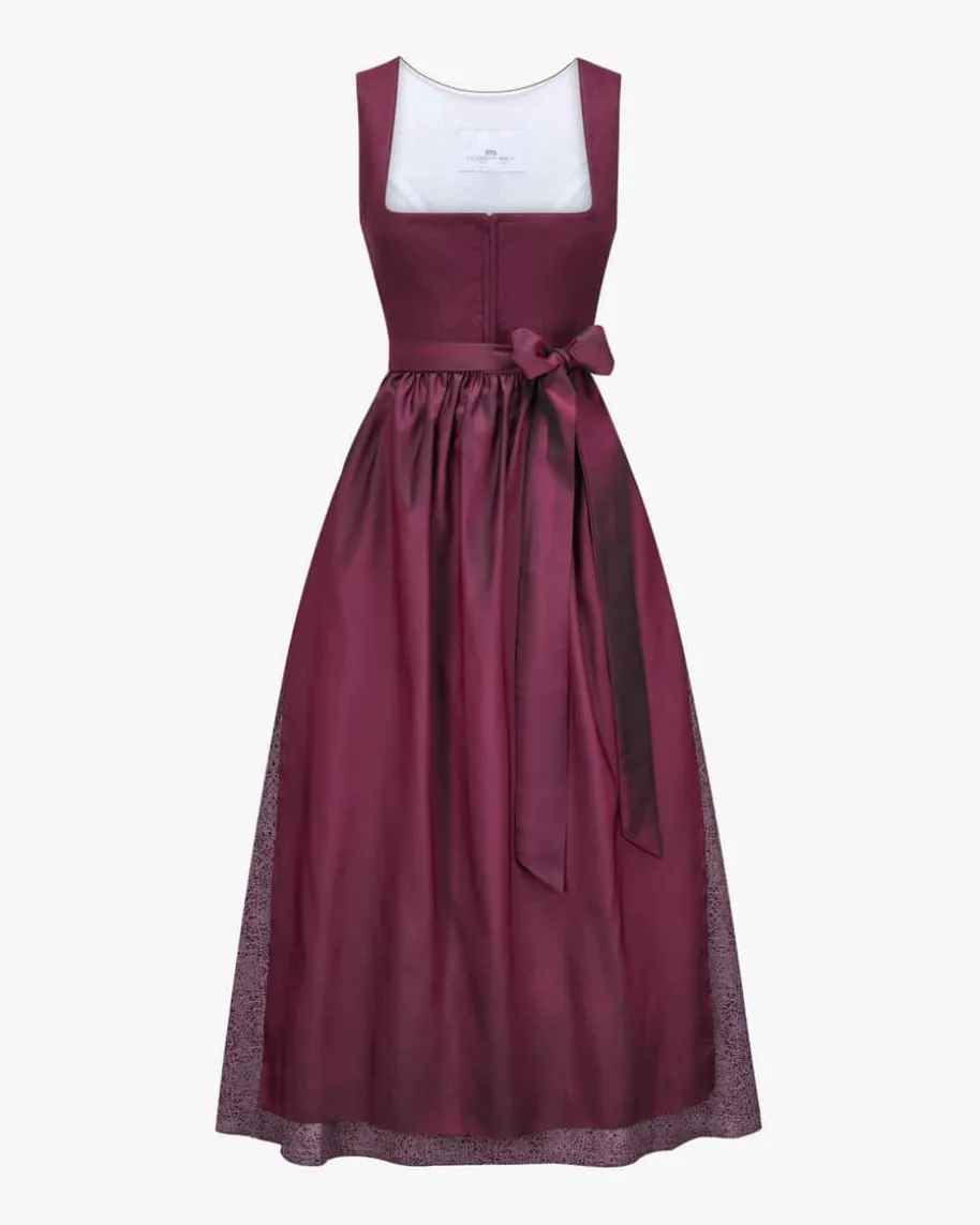 Wiesndirndl lang mit Schürze für Damen von LODENFREY München 1842 in Weinrot undAubergine. Dank der Verwendung von hochwertiger Leinen-Qualität im Mieder undeinem feinen Ornament-Muster im Baumwoll-Rock wird ein traditioneller Favoritmit minimalistischem Charme kreiert. Die changierende Schürze mit Seide rundetdas Trachten-Gesamtbild harmonisch ab.