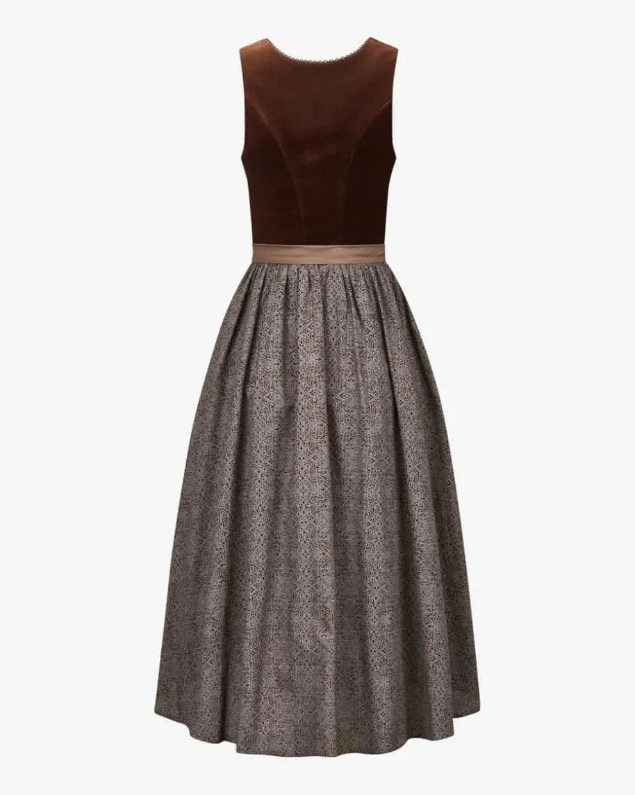 Wiesndirndl lang mit Schürze für Damen von LODENFREY München 1842 in Braun undHellbraun. Dank der Verwendung von hochwertiger Baumwollsamt-Qualität im Miederund einem feinen Ornament-Muster im Rock wird ein traditioneller Favorit mitminimalistischem Charme kreiert. Die changierende Schürze mit Seide rundet dasTrachten-Gesamtbild harmonisch ab.