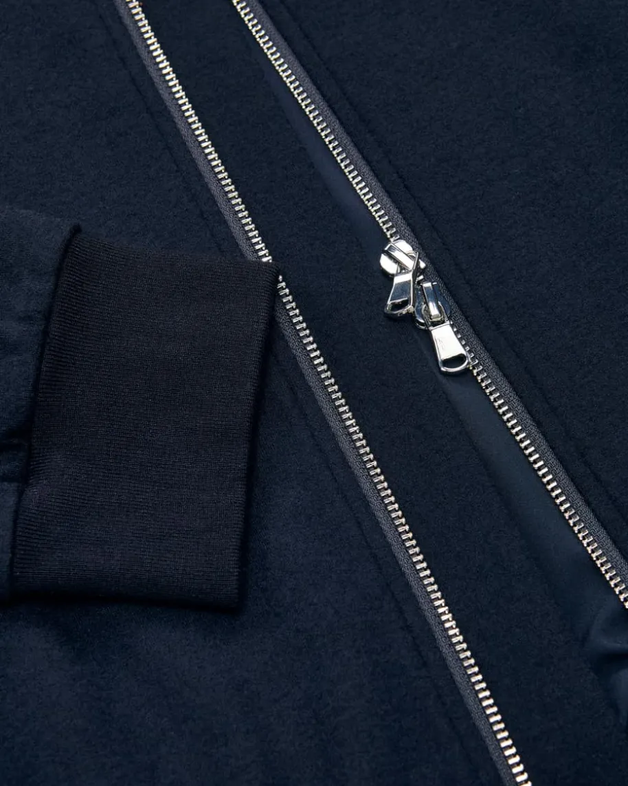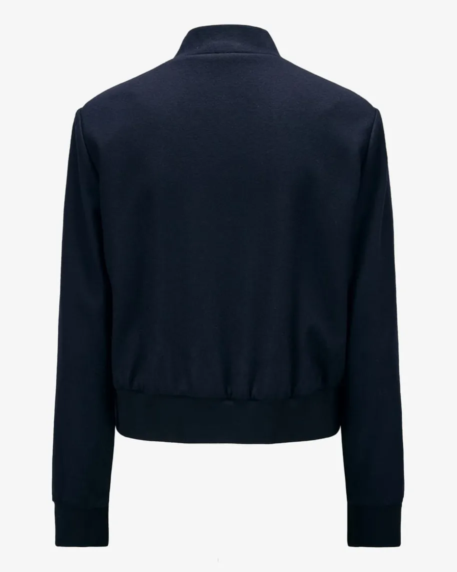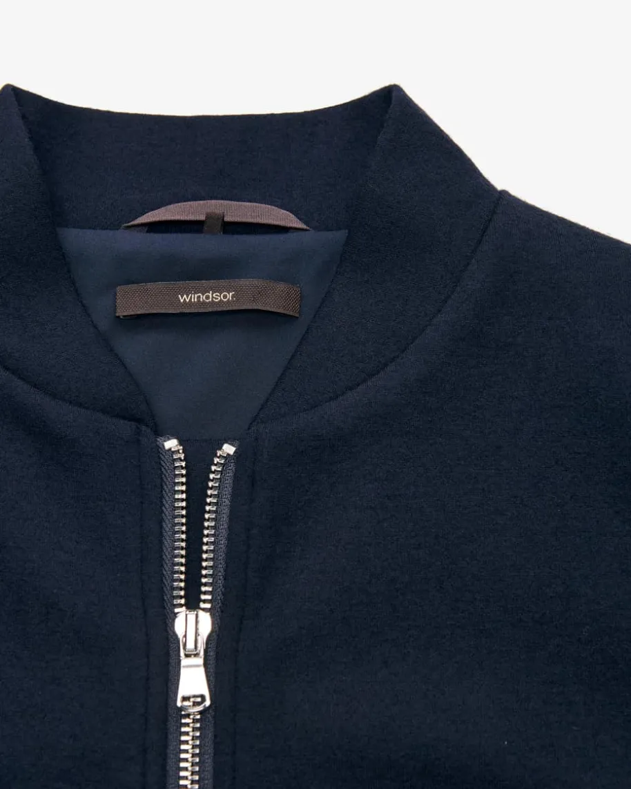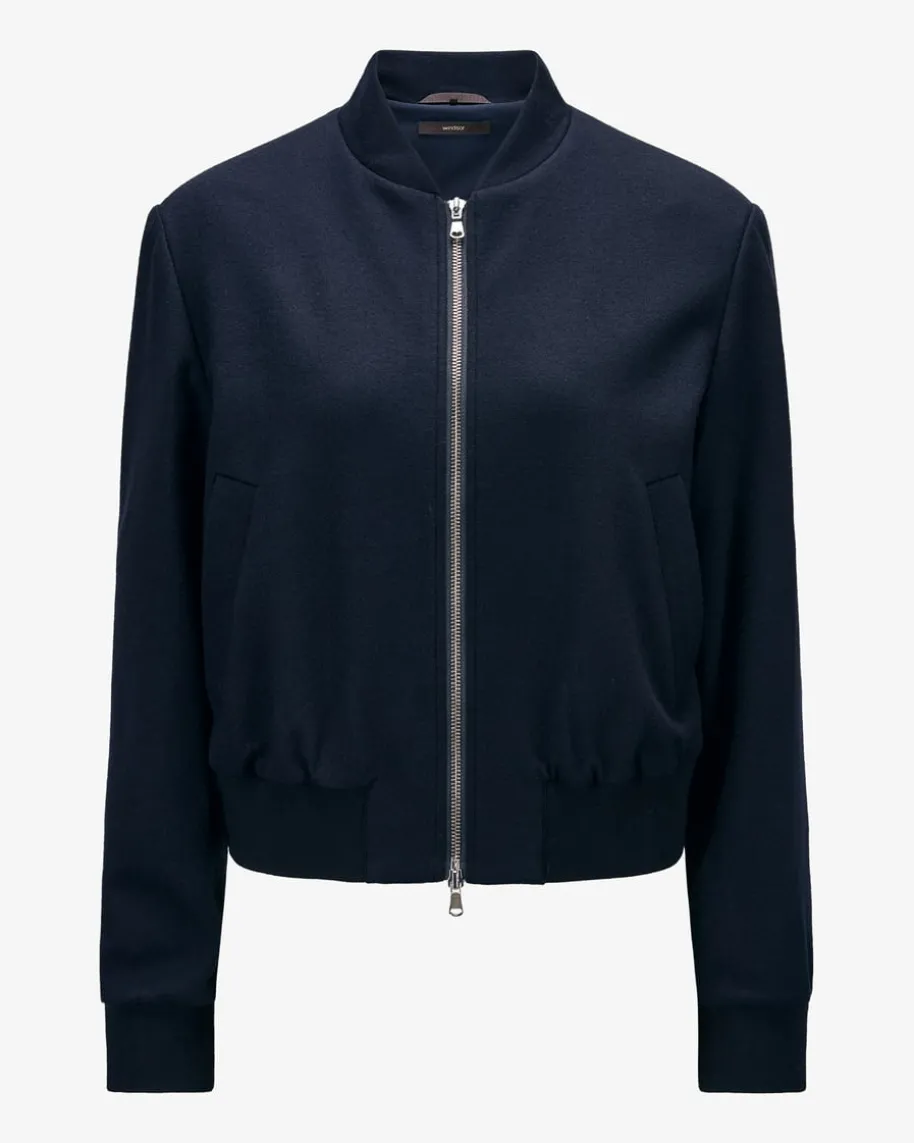 Woll-Blouson für Damen von Windsor in Navy. Das Schweizer Label steht fürelegante Businessmode und urbane Klassiker mit dezentem Luxusanspruch. Auchdieses Modell punktet mit weicher Wolle, die angenehmen Tragekomfort garantiert,während die sportive Silhouette mit Collegekragen und Rippstrick-Details einenmodisch-legeren Look schafft.