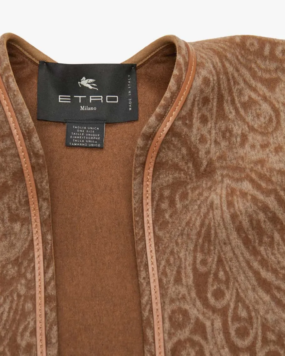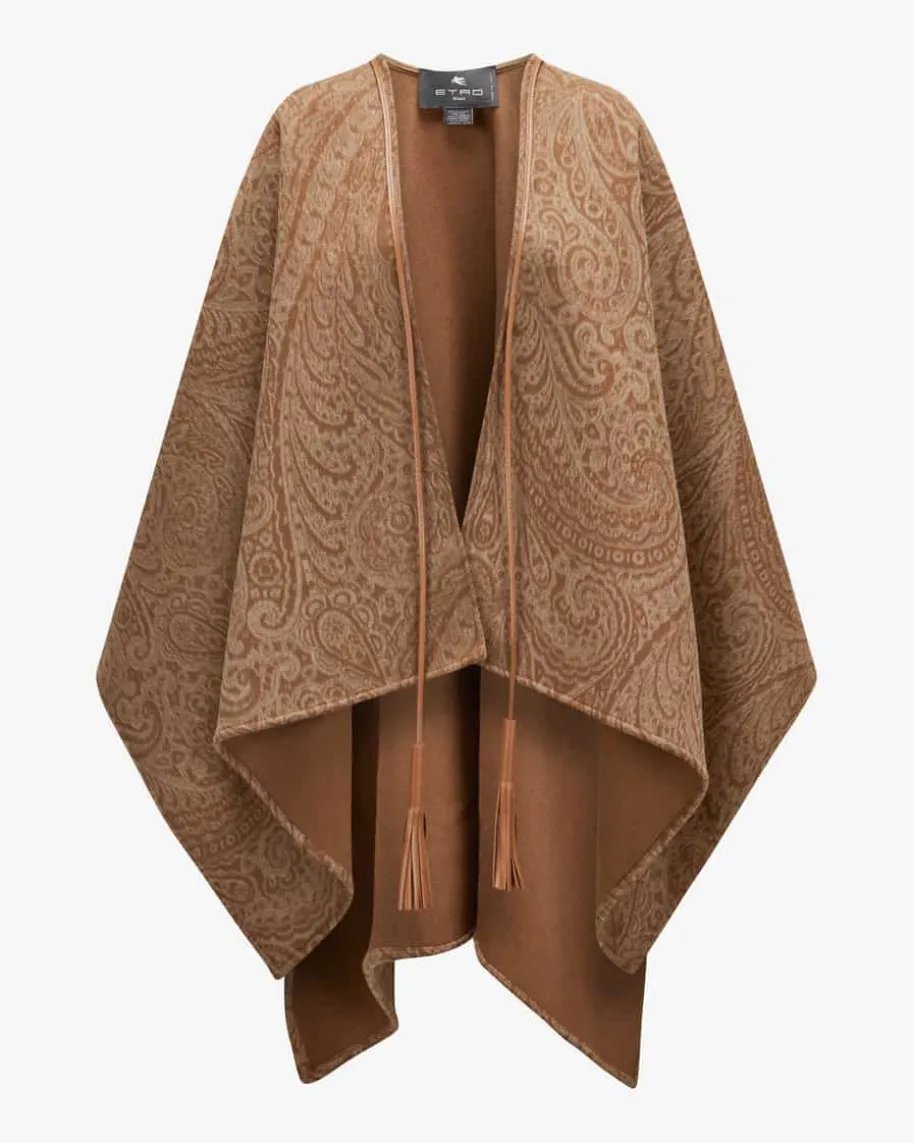 Woll-Cape für Damen von Etro in Hellbraun und Sand. Das weite Modell punktetdankhochwertigem Woll-Cashmere-Mix mit einer weichen Haptik, während daslabeltypische Paisley-Dessin den Look stilvoll in Szene setzt. Für ein optischesHighlight sorgt zudem das tonale Lederband mit Quasten-Detail.