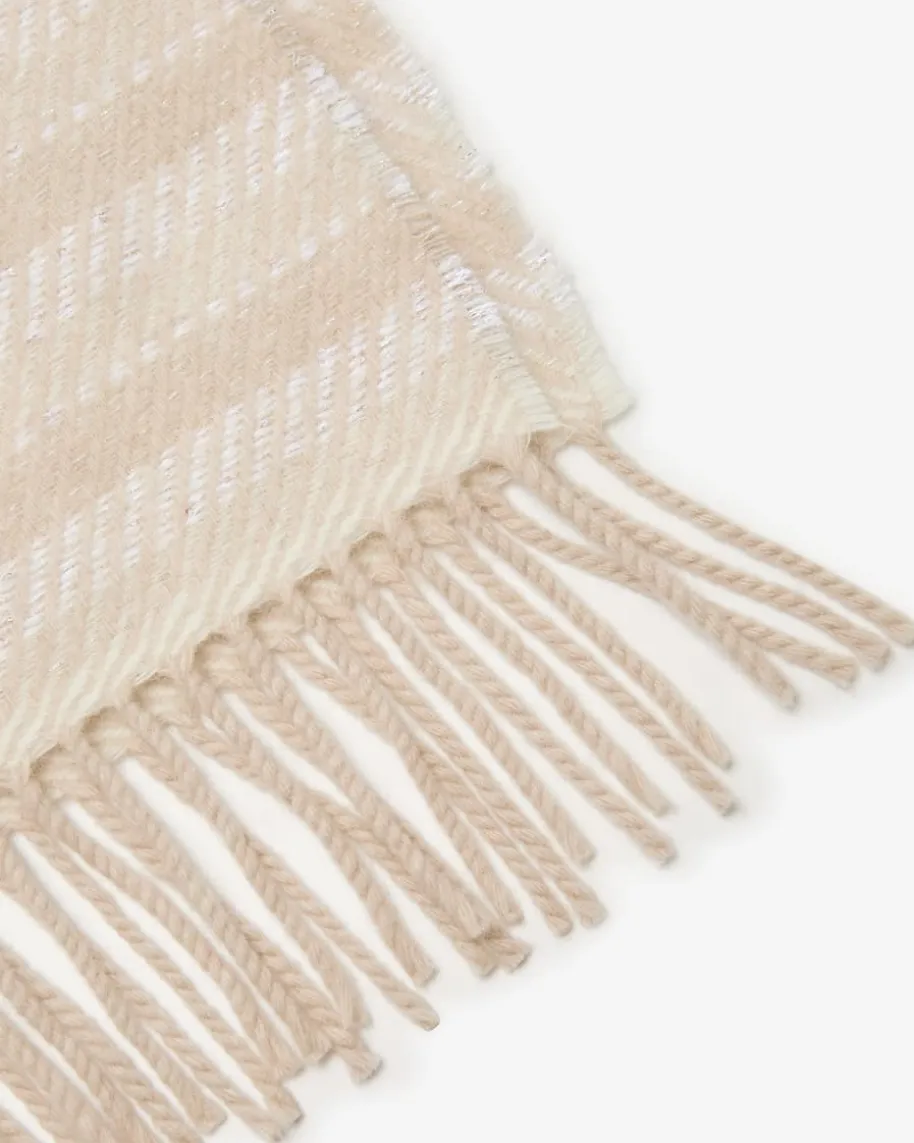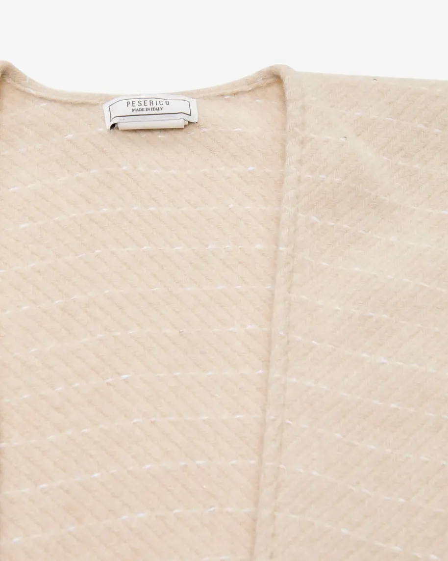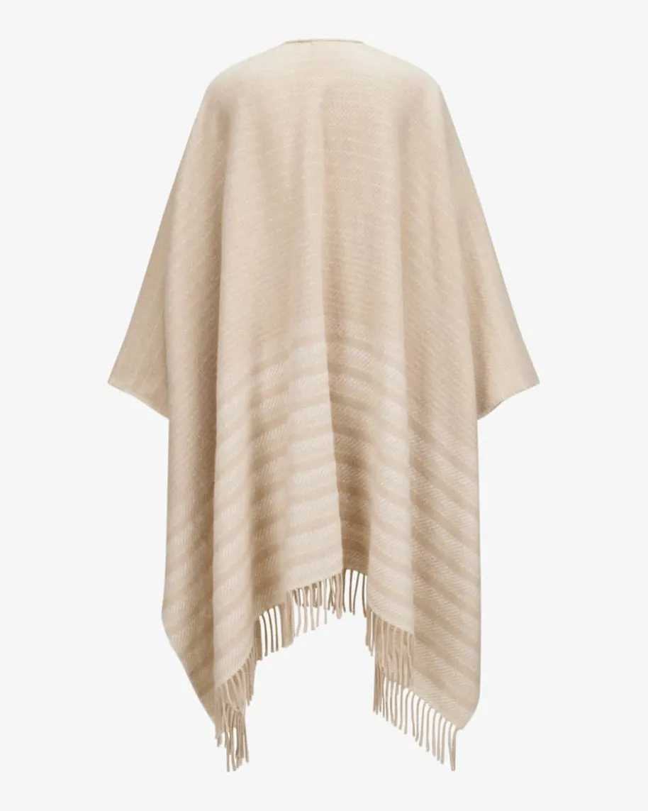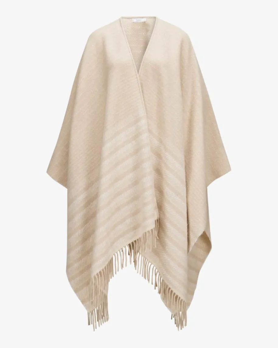 Woll-Cape für Damen von Peserico in Beige und Creme. Das Modell im Oversize-Lookpunktet mit vielseitigen Layering-Kombinationsmöglichkeiten, während derhochwertige Woll-Cashmere-Mix mit dezentem Streifenmuster und zarten Paillettenfür angenehme Tragemomente sorgt und zugleich optisch überzeugt.