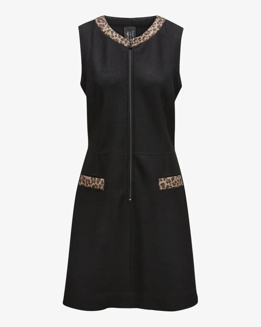 Wollkleid für Damen von Marc Cain in Schwarz und Braun. Zeitgemäße Styles mitsportivem Touch – Das Minikleid überzeugt dank der reinen Schurwoll-Verarbeitungmit weicher Haptik und eleganter Optik, welche durch die gesteppten Details mitLeopardenmuster modern unterstrichen wird.
