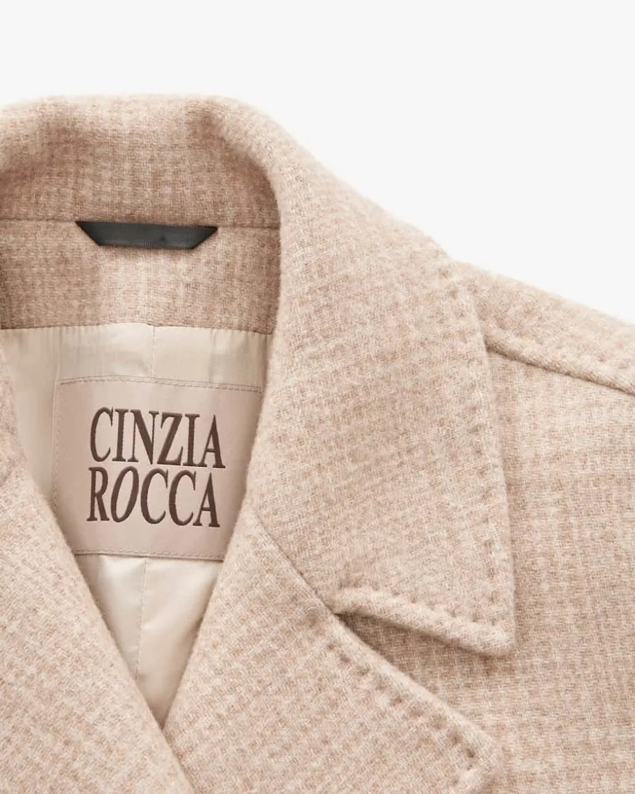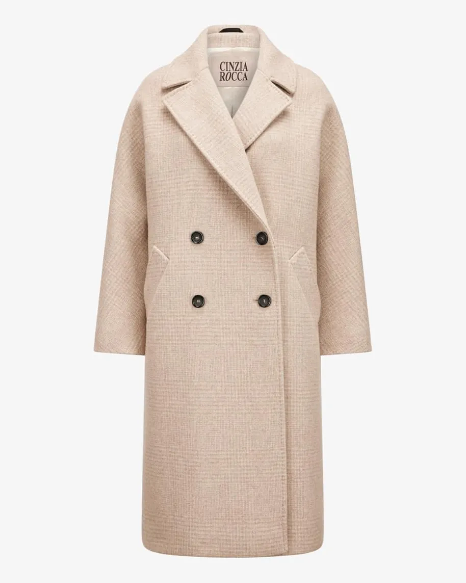 Wollmantel für Damen von Cinzia Rocca in Beige. Seit den 1980er-Jahren stehtCinzia Roccas Damenmode für Urban Couture Luxus. Auch dieses Modell punktet mitder Verwendung von hochwertigem Schurwoll-Mix, während die weite Passform mitdoppelreihiger Knopfleiste sowie dem feinen Hahnentritt-Muster einen modernenCharakter verleiht.