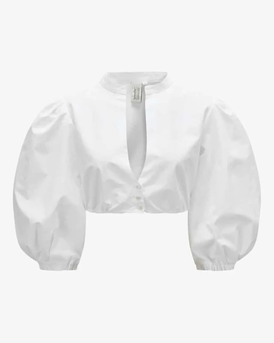 Magarethe Dirndlbluse für Damen von Windsor in Weiß. Das Modell ist Teil derTrachten-Capsule Collection zwischen CocoVero und Windsor, welche dentraditionellen Trachten-Look mit modernen Elementen kombiniert. Die klassischeAufmachung in glatter Baumwoll-Qualität wird durch die voluminösen Ballonärmelmit Falten-Details an den Schultern stilvoll in Szene gesetzt.