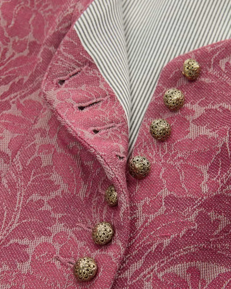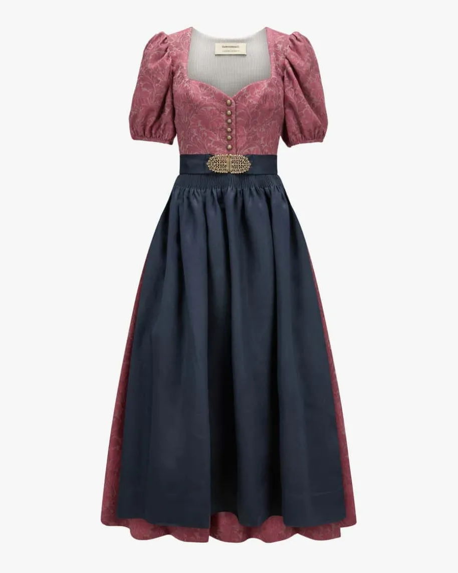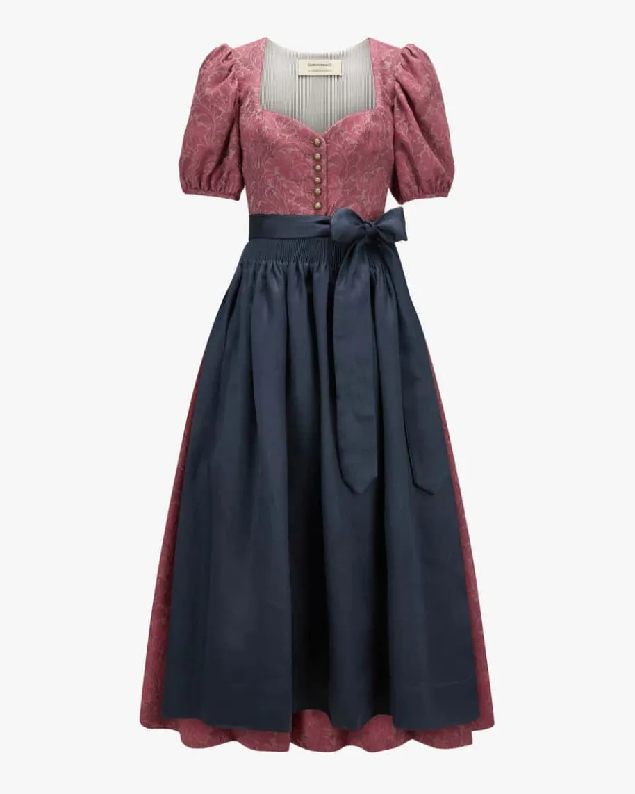 Lina Dirndl lang mit Leinenschürze für Damen von Gottseidank in Himbeere undTaupe. Tracht mit modernem Zeitgeist – Dank des floralen Allover-Mustersbegeistert das Modell in traditioneller Aufmachung mit modernem Charme, währendraffinierte Knöpfe den letzten Schliff verleihen. Zugleich rundet die schlichteSchürze das Trachten-Design mit angesagten Puff-Ärmeln gekonnt ab.