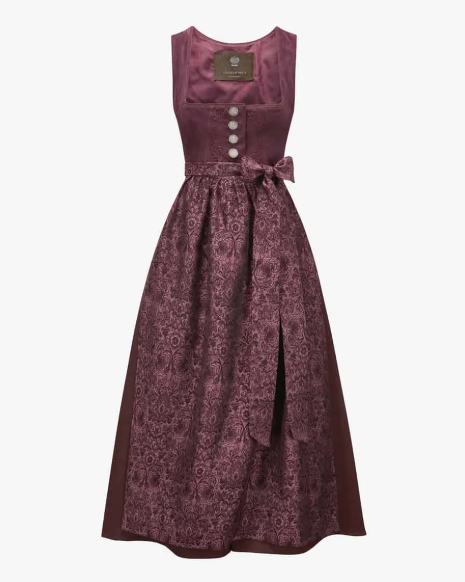 Linderhof Dirndl lang mit Schürze für Damen von Meindl in Dark Cherry. DasModell spiegelt die hochwertige Lederhandwerkskunst von Meindl gekonnt wider.Das Mieder besticht durch die Verwendung von weichem Veloursleder und wird durchfeine Zierstickereien stilvoll ergänzt. Zugleich setzt der Rock aus meliertemWoll-Mix das traditionelle Design gekonnt in Szene, während die Schürze mitfeinem Paisley-Dessin das Gesamtbild harmonisch komplettiert.