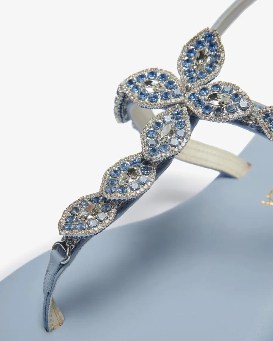 Zehentrenner-Sandalen für Damen von Paola Fiorenza in Azur. Das Modell inhochwertiger Leder-Aufmachung avanciert zu ihrem neuen Sommerliebling, der sichdank des auffälligen Schmuckstein-Besatz in Ornamenten-Dessin sowohl elegant alsauch casual stylen lässt und jedes Outfit zu einem optischen Highlight macht.