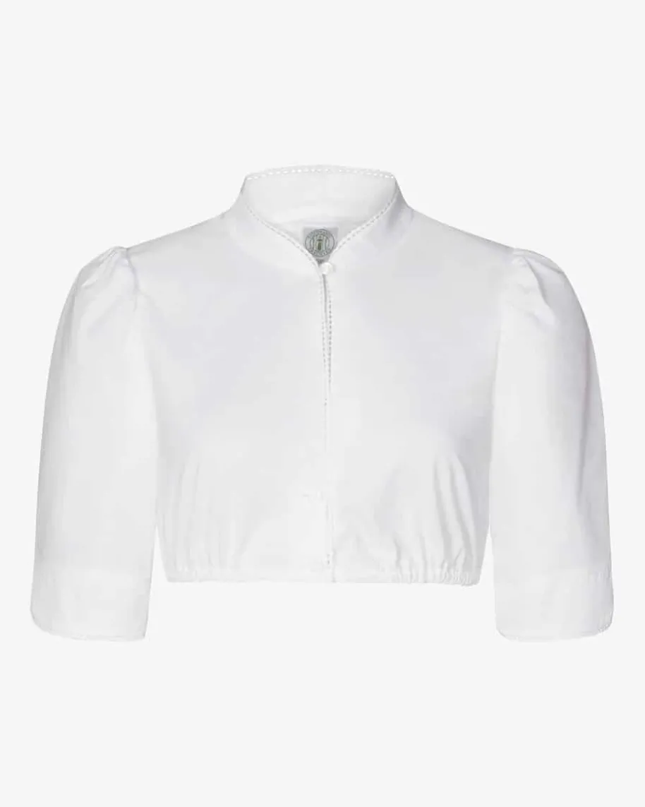 Zoe Dirndlbluse für Damen von Tostmann in Weiß. Die hochgeschlossene Blusebesticht durch den dezenten Stehkragen und die zarten Häkel-Borten an denSäumen.